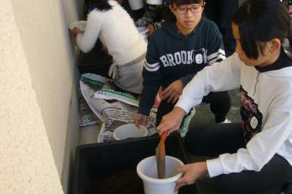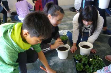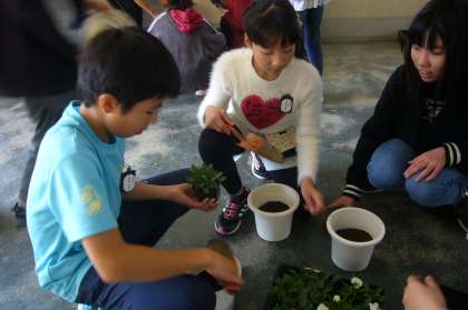 6年3組が一人一鉢運動の苗の植え替えを行いました。
