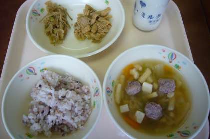 今日は、米、麦、きびの五穀ご飯でした。たこだんご汁はタコがしっかり入った団子にえのきたけ、そしてツルッとした豆腐の食感を味わっていただきました。みそぶたはみその味がよく、ごはんが進みました。レンコンのきんぴらはこりこりとしたレンコンとゴボウをしっかりよく噛んでいただきました。