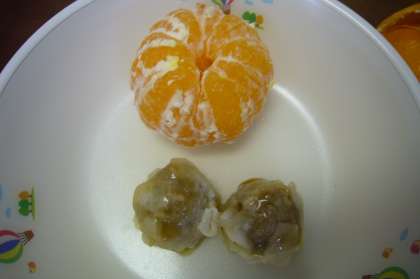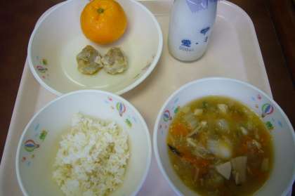 今日は発芽玄米ごはんでした。食物繊維たっぷりのごはん、しっかり噛んでいただきました。八宝菜の具は、イカ、エビ、ウズラたまご、ニンジン、タケノコ、玉ねぎ、ハクサイ、シイタケです。ピリッとショウガで調えられた味がよかったです。しゅうまいのあんかけはとろっとしたあんが絶妙でおいしくいただきました。旬のみかんは爽やかな酸味を味わっていただきました。