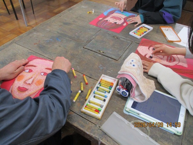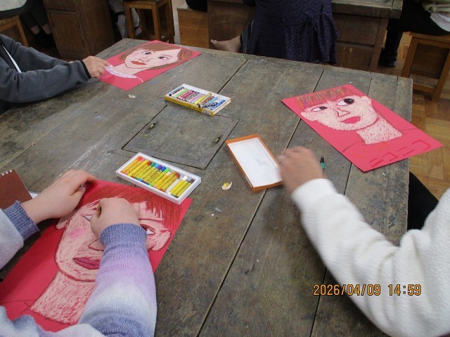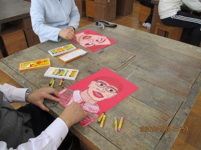 児童が帰った後、先生たちが、自画像の描き方の研修会を行いました。