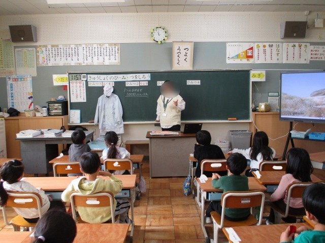 栄養教諭の先生が1年1組に来てくれて、給食のひみつについて教えてくれました。