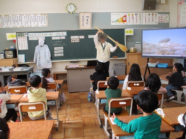 いつも給食を作っているときに使っている道具の、スパテラとひしゃくを教室に持ってきてくれました。代表の人が背比べをしたり、水の入った袋をひしゃくに入れて持ってみたりしました。