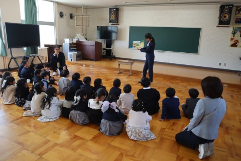 式の後は、保護者の方向けに担任が話をする間に、新1年生は、校舎内を歩いた後、本の読み聞かせを行いました。