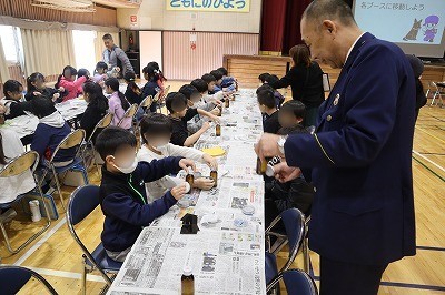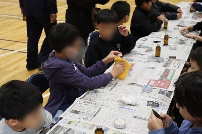 指紋ブースでは、警察役と犯人役に分かれ、ビンについた犯人役の指紋を、警察役が鑑識さながらに採取する体験をさせていただきました。