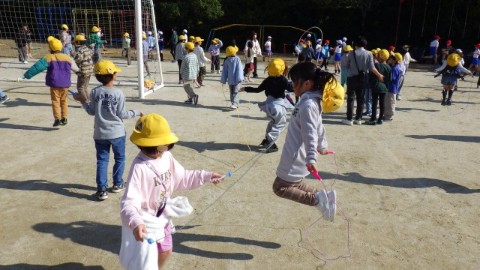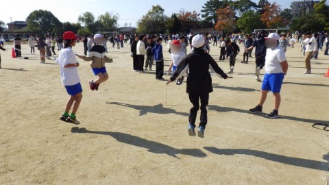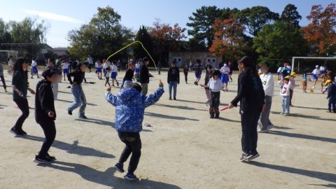 2時間目の後の休み時間、鬼南タイムを使って、全校児童が短縄に取り組んでいます。
