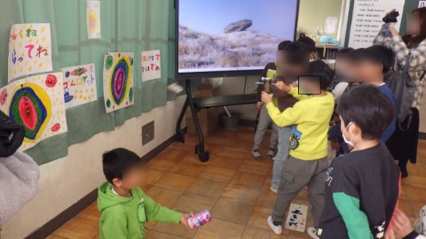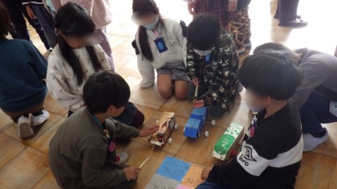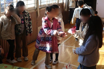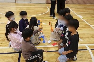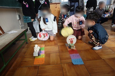1・2年生のおもちゃパーティーの様子です。2年生が作ったおもちゃで1年生と一緒に遊びます。コトコト車、ぴょんコップ、ストローアーチェリーなど2年生が工夫を凝らしたおもちゃの遊び方やルールを1年生に丁寧に説明していました。1年生はいろいろなおもちゃで楽しく遊びました。1・2年生の交流の輪が広がりました。
