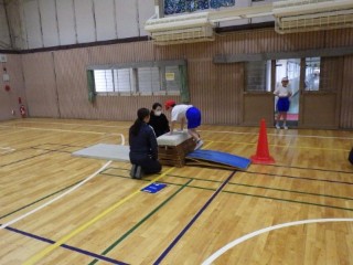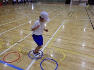 体育の授業の様子です。1・3組が合同で運動をしています。跳び箱(開脚跳び)、ケン・ケン・パ、跳び箱(閉脚跳び)をサッーキットトレーニング的に運動しています。