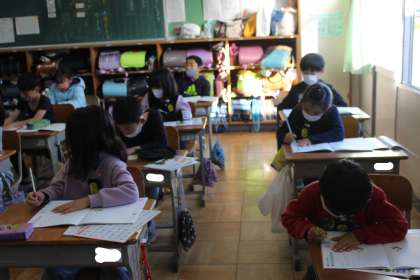 上 2年1組 書写 書写コンクールの作品に取り組んでいます。とても集中して書いています。