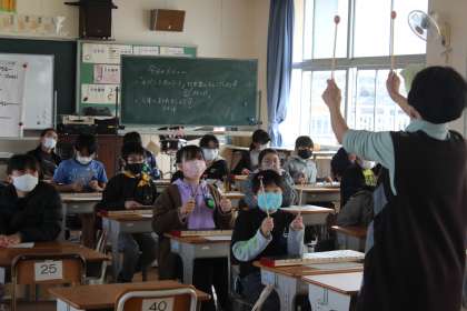 下 5年4組 音楽 木琴・鉄琴パートの演奏の仕方を学習しています。