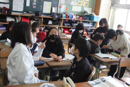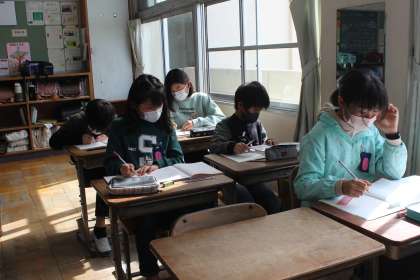 下 4年1組 国語 「読んで感じたことをまとめ、伝え合おう」「初雪のふる日」を読みとり、どこからがファンタジーの世界に入ったのか、意見交流をしています。