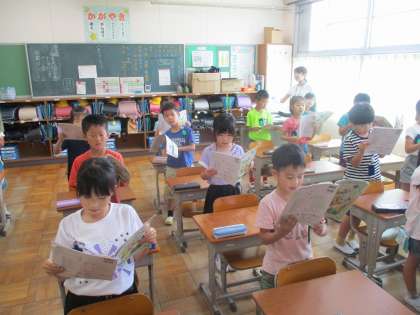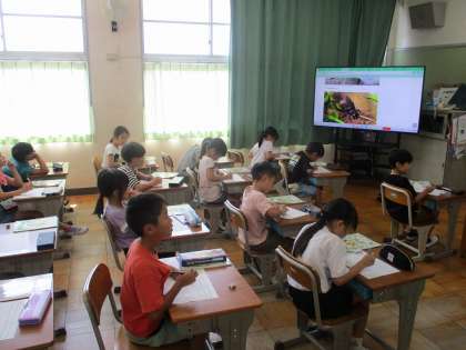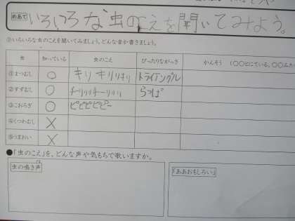 「にじのクレヨン」を歌ったり、虫の声を聞いてそのこえにぴったりあう楽器を考えたりしています。