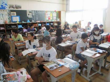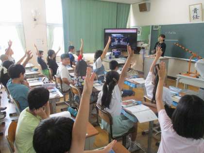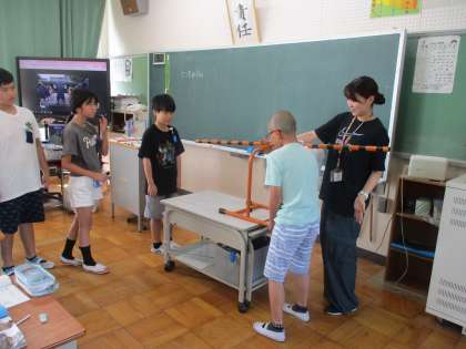 理科の授業で「てこ」について学習しています。てこを使って、感じたことを伝え合っています。