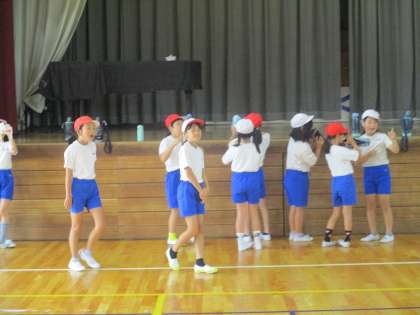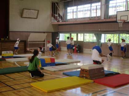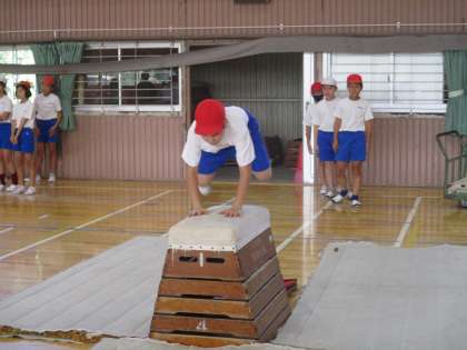 体育の授業で、跳び箱の練習をしています。水分補給、休憩の時間を確保して、熱中症に気をつけて活動しています。