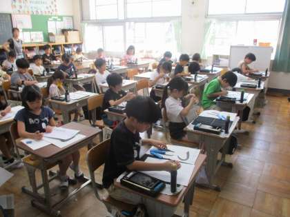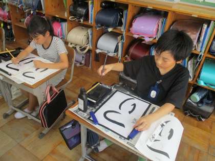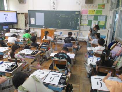 書写の授業で、「つり」を練習しています。どの児童も真剣に練習しています。