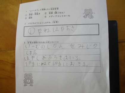 身体測定を行った後、生活習慣について考える時間を設けています。授業の最後に「自分がよくしようと思う生活習慣」について、工夫することをまとめています。