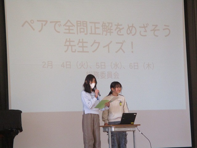 ペアとの中がさらにようなるように、総務委員会が鬼南タイムに【ペアで全問正解をめぞう先生クイズ!】を企画しました。明日も他の学年がクイズに答えるため、問題はお伝えできませんが。「○○先生の好きな○○は何でしょう」の3択クイズです。ペアで楽しい時間を過ごしていました。