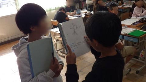 理科の授業の様子です。太陽の位置とかげの関係について学習しています。「正午はだいたい上らへんにあるから、かげが短い、でも午前10時や午後2時はななめにあるのでかげが長くなるのかなと考えました。理由は、太陽が上にあるとかげは下(真下)になると思ったからです」