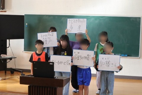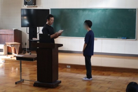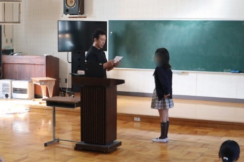 朝会の校長先生のお話のあと、児童会役員選挙の結果を受けて前期・後期の引継ぎ式を行いました。前期の人たちは、「私たちが企画した活動を、みんなが楽しんでくれていることがうれしかった。」「自分で企画を提案し、実行できたことがうれしかった」など、充実感のあふれる感想を伝えてくれました。後期の皆さんも、鬼南っ子のみんなが、仲良く楽しく学校生活を送ることのできる企画をたくさんしてほしいと思います。よろしくお願いします。