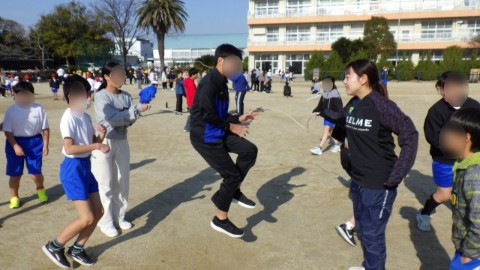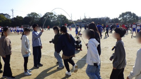 2時間目の後の休み時間、鬼南タイムを使って、全校児童が短縄に取り組んでいます。