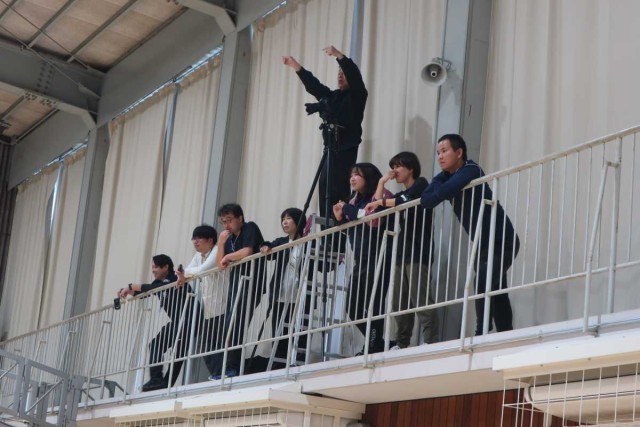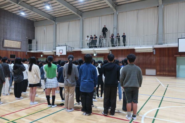 担任の先生たちが、見守る中、体育館で全体写真撮影がありました。