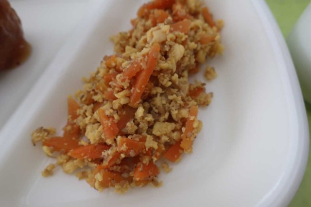 おいしそうに食べていますね。2月の食べ物カレンダーが人参だったので、ニンジンメニューをお母さんと考えたそうです。卵を入れて、優しい味付けにしたそうです。