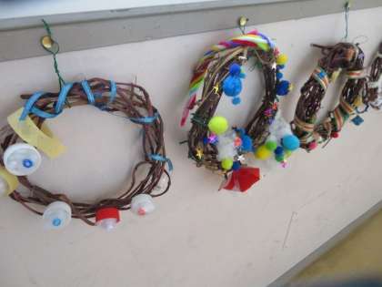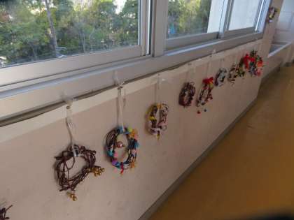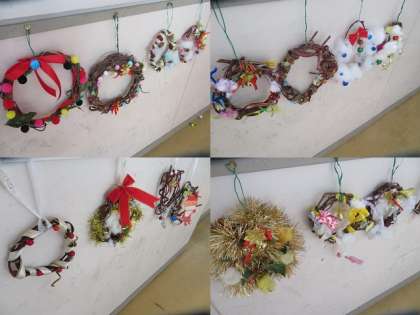 2年生の廊下に、素敵なリースが飾ってあります。サツマイモを収穫して時にとっておいたツルを、丸めて乾燥させました。思い思いの飾りをつけて、素敵なリースができあがっていました。