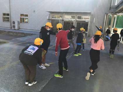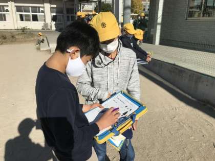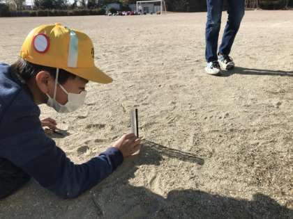 算数の少人数学習の1つのコースが、発展学習として、南館校舎の体積を求めていました。複雑な形をいくつかの直方体として考え、それぞれの縦横の長さを実測しました。ここからが問題で、校舎の高さが分かりません。棒の影が作る三角形と、校舎と影が作る三角形の相似を使って、高さを求めました。