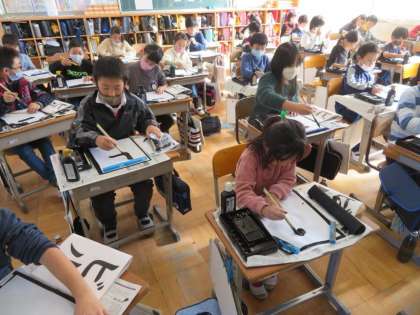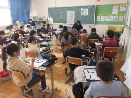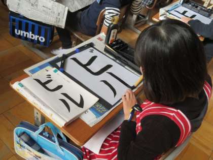 「まがり」と「おれ」の筆使いに気を付けて練習しました。「ビ」のまがり、「ル」のおれ、一字ずつ確認しながら練習しました。