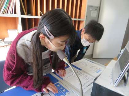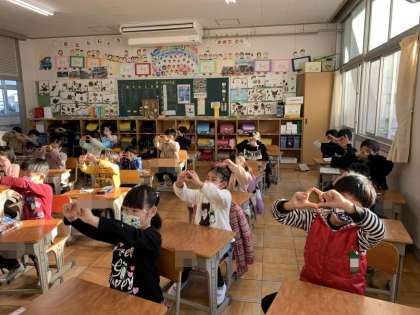 はじめに、利き手を問いかけた後、利き目をみんなで確かめました。黒板に書いた星印を、真っ直ぐに伸ばした手で作った輪の中に入れます。この時、真っ直ぐ両目で見るようにします。次に左右の目を交互に閉じて、ズレが小さい方が利き目です。
