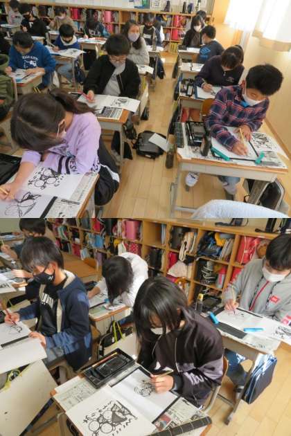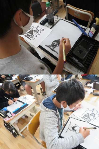 2学期最終図工は、水墨画に挑戦です。ウォーミングアップに知多で有名なぜんきゅうさんのお地蔵さんを真似て描いてみました。墨と水の量を調整しながら、濃淡を工夫にながら描いていました。みんななかなかのできで、この後の本作品の完成が楽しみです。