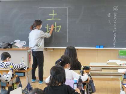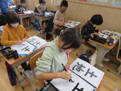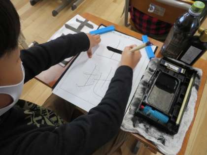 文字の左右の組み立てに気を付けて書きます。筆を入れる場所、筆を離す場所を記した用紙で、まずは練習です。