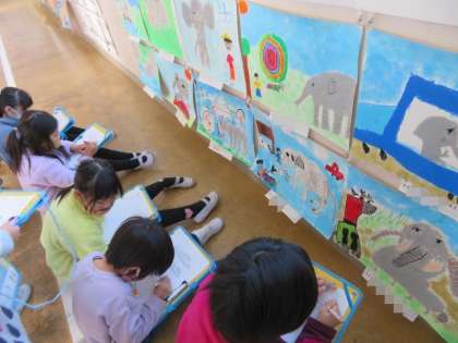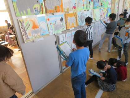 読書感想画の鑑賞をしていました。この学級は、担任の「ぐるんぱの ようちえん」の読み聞かせを聞いて、心に残った場面を絵にしました。