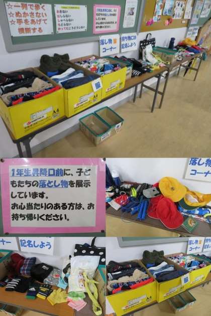 1年生昇降口(保健室前)に、落とし物が展示してあります。お子さんのものがありましたら、お持ちください。