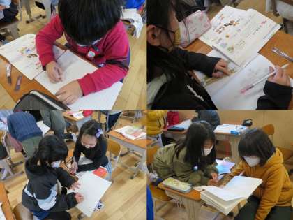 教科書に載っている冬の出来事の言葉、「正月」「大みそか」「節分」「冬至」から1つ選んで、そこからイメージする言葉をつなげていきます。おせち、ぞう煮、年越しそばなどの食べ物、凧揚げ、羽子板などの遊び、たくさんの言葉を書き出すことができました。