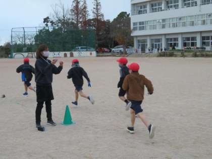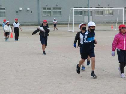 5分間、自分のペースでトラックを走りきります。ゆっくりでもいいので、最後まで止まらずに走ることが大切です。寒い運動場ですが、ほっぺを赤くしながら、一生懸命走ることができました。