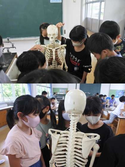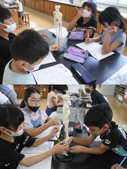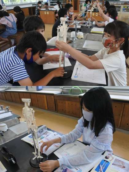 人や動物の体が動く仕組みを学習します。骨と筋肉のつくりを調べます。この日は、骨格標本を見ながら、人の骨のつくりを調べました。