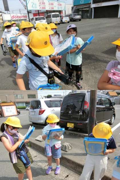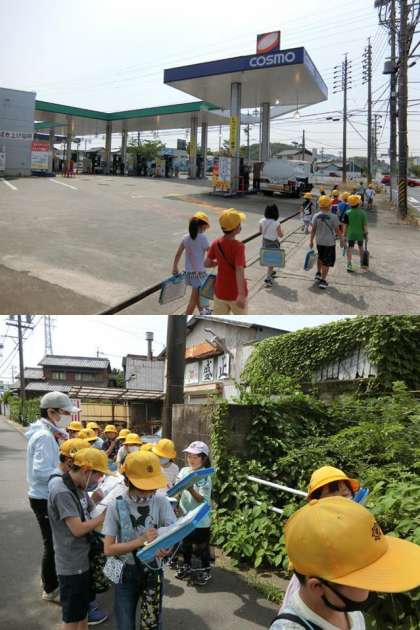 6月8日、2年生が町探検に出かけました。東小の東側247号線沿いのお店や町の様子を調べに行きました。とても暑い日で、適宜休憩をとり給水をしながら行ってきました。