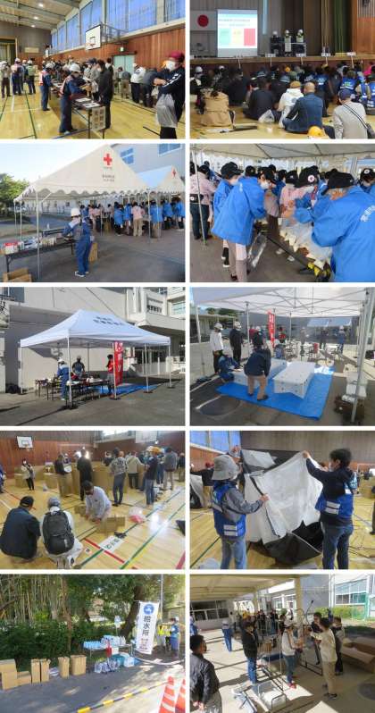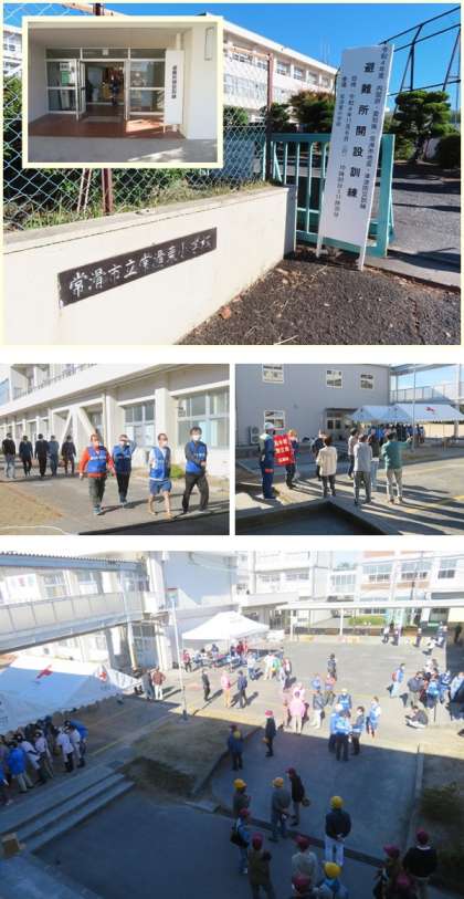 11月6日(日)、東小で避難所開設訓練が行われました。大地震が発生し、津波警報が出された想定で、北条・奥条・瀬木・保示・市場区の皆さんが、避難所である東小に避難をし、体育館に避難所を開設するという訓練を行いました。各区の皆さんによるテント・パーティション・簡易トイレの設置、赤十字の皆さんの炊き出し、医師団による救護所、市による給水などが行われました。知事も来場され、訓練の様子を視察していきました。