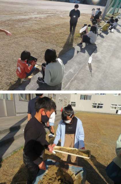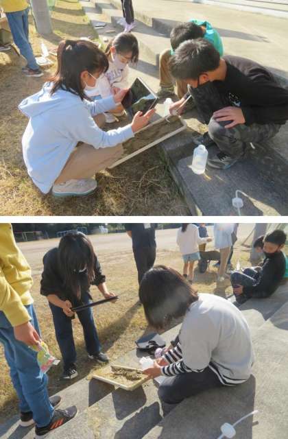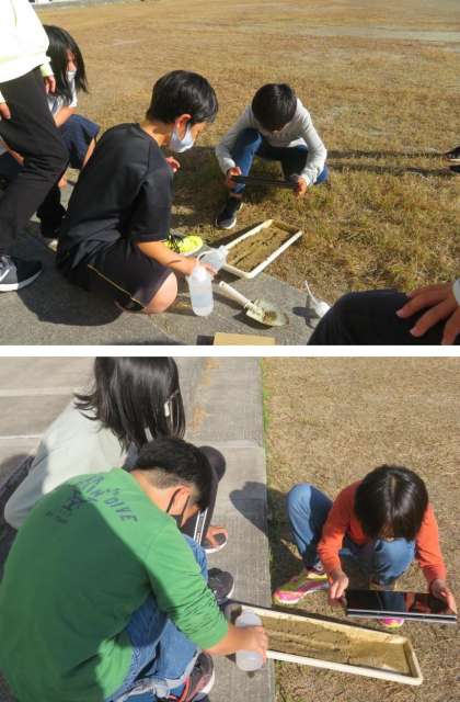 川を流れる水の働きを調べます。プランター用の皿に土を盛り、水を流して、浸食・運搬・堆積の様子を観察しました。タブレットで動画を撮影して、後で何度も見られるようにしました。見直すと、その時気付かなかったことを見つけることができるかもしれません。