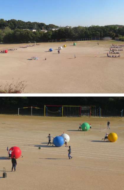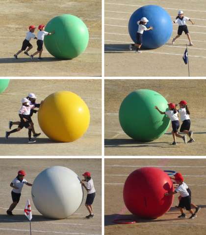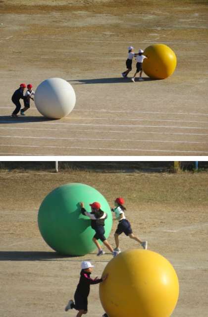 大玉ころころの練習です。運動会まで、あと数日。その間に、きっとクラスごとに作戦を練ってくると思います。勝利の女神は、何組に微笑むのでしょうか。お楽しみに。