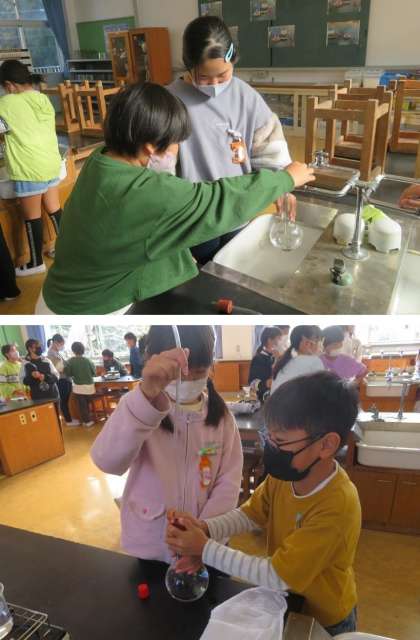フラスコの丸い部分をお湯につけて温めて、温度上昇による体積の変化を調べました。