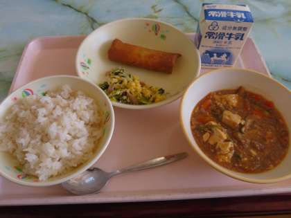 11月9日の給食には、今月の応募献立の小松菜と卵の中華炒めが付きました。これは、鬼崎中学校の生徒が考えたメニューです。
