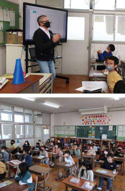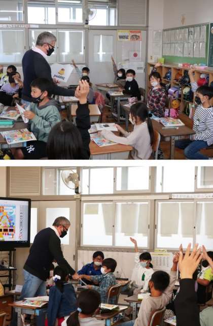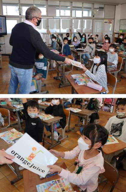 ALTとの英語活動の授業です。「はい、どうぞ。」「ありがとう。」と、相手にプリンやオレンジジュースなどを渡します。本物は使えないので、カードで渡す練習をしました。