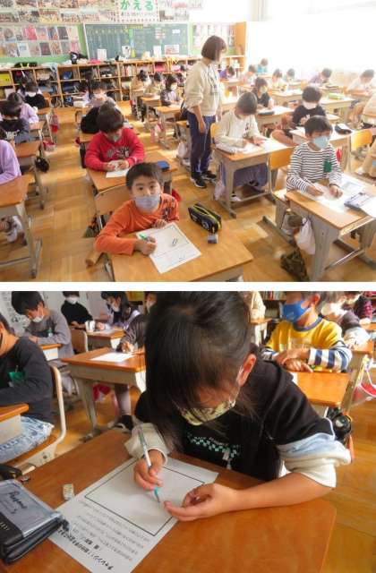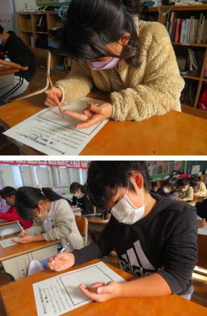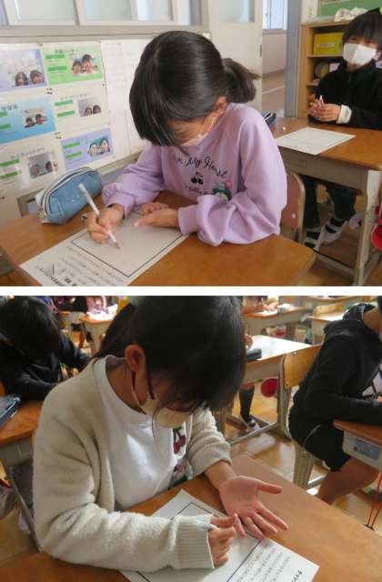 ジッと手を見つめる子供たち。悩みを抱えた子の姿ではありません。運動会の思い出の場面を描く前のウォーミングアップです。手のデッサンに挑戦しました。