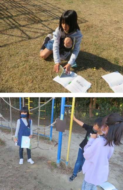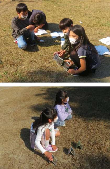 鏡に跳ね返った光を、いくつも重ねた時の温度がどうなるのか調べました。0枚、1枚、2枚、3枚と、鏡を1枚ずつ増やしていき、光が重なった部分の温度を調べました。