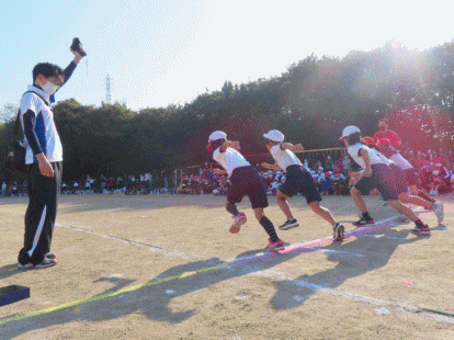 3年生徒競走は、75mを走ります。最初のコーナーまでの距離を確保するために、昨年度よりスタート位置を下げました。スタートからコーナーまでの直線が勝負です。