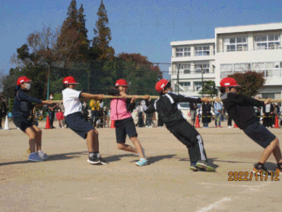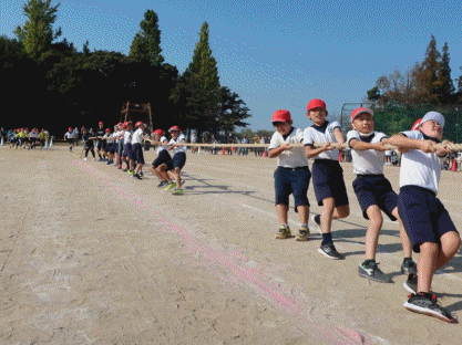 5年学年競技は、ランニング綱引きです。走りながら綱引きをするのではありません。各クラス、3つのチームに分かれ、最初は1つのチームで綱引きをします。そこへ、残り2チームが、順番に援軍とあり駆けつけます。以下に速く、援護に駆けつけられるかで勝敗が左右されます。