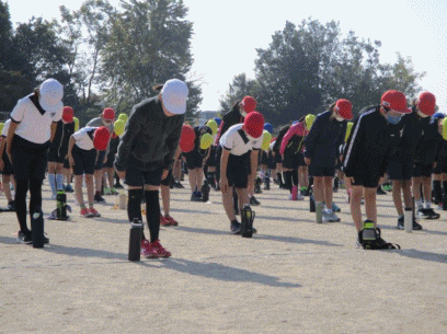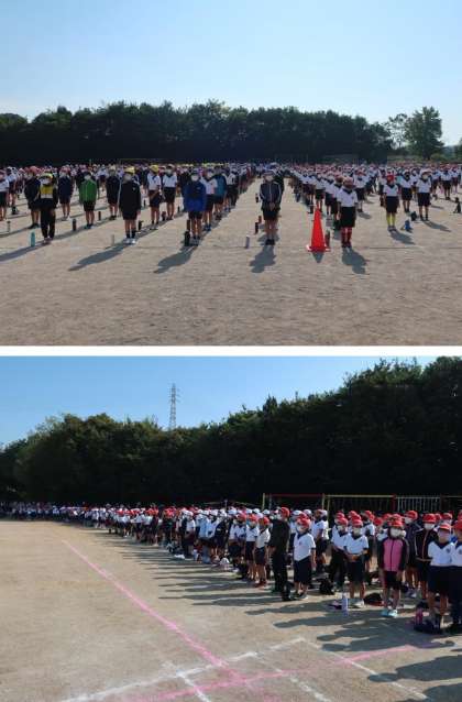 児童数の増加、コロナ予防のため、全校児童が一堂に会して競技を行うことがとても難しい状況で、この運動会を前後半に分けて行いましたが、前半の閉会式と後半の開会式を兼ねて引継式を行いました。短い時間ですが、全校児童が運動場に勢揃いしました。