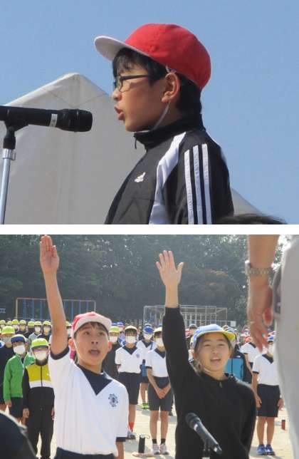 前半1・3・5年生の代表児童がメッセージを送り、後半2・4・6年の代表児童が引き継ぎのメッセージを盛り込んだ選手宣誓を行いました。