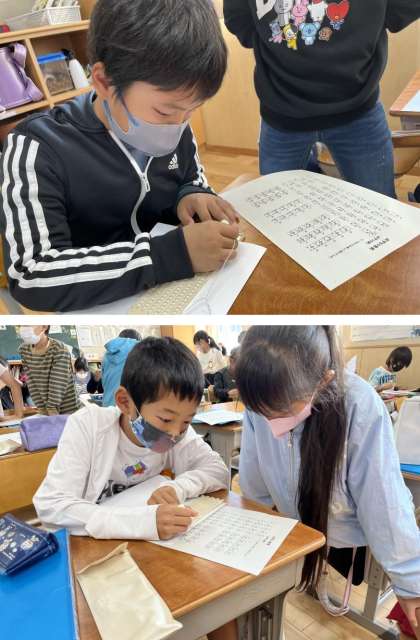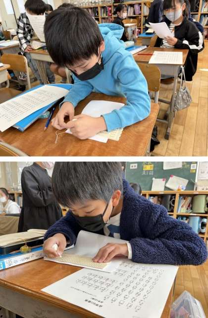 福祉の学習です。点字盤を使って、自分の名前を打つことに挑戦しました。普段見慣れない文字ですので、一文字一文字確認しながら打っていきました。点字を打つことの大変さと、点字を読むことの難しさを体験しました。